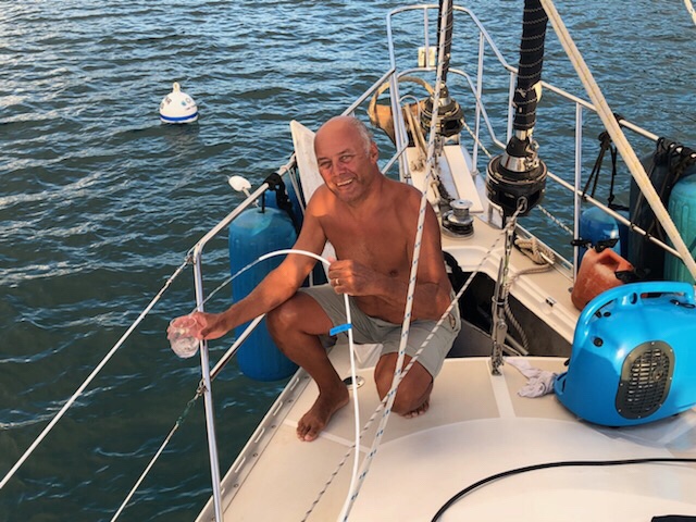 Mike and I alone figure we use a sparing 5 gallons per day. That is between consumption and washing, whereas we use a bit more when we are snorkeling a couple of times a day or if we have visitors aboard. It’s quite difficult to always remind friends and family to conserve the water.