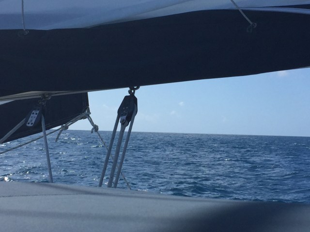The waves continued to build as we headed into the channel between the islands, as it usually does and we were occasionally hit by some huge ones breaking over the bow, and onto the boat. We counted four that soaked the cockpit, thankfully we had the companionway closed off. Winds were steady from the East, putting us at a good 25- 30 degree heel, which puts the downwind rails underwater and makes getting a good stance challenging while manning the sails. It meant being ready to let out sail if the winds were overpowering our set up. If the sea salt soaking wasn’t enough, we contended with 3 squalls with winds up to 27 knots, ……but of course its fresh water we say, cleaning the salty sails!